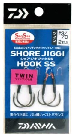驚異の貫通力のサクサスフック、高強度のシーハンターを採用したショア専用アシストフック。シングルはタテアイ、ダブルはヨコアイにすることでジグミノーからプラグ向け