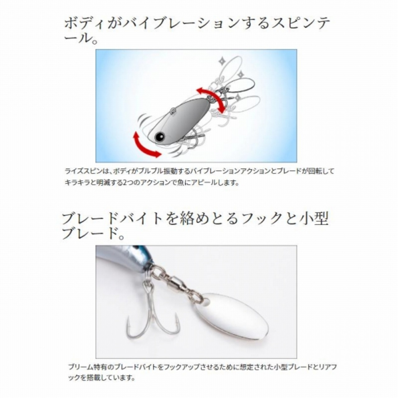 既存のスピンテールはアングラーに伝わる振動が少なく、扱いが難しいと感じることもしばしば。しかしライズスピンはボディがブルブルとバイブレーションするので、アングラーにしっかりアクションが伝わります。また、小型ブレードを搭載することで早巻きにも対応。シャローを通したい時、リトリーブスピードを上げてアプローチしたい時に有効です。小型ブレードは速く巻けるだけでなく、ブレードバイトでの吸い込みやすさ、というメリットも併せ持っています。
