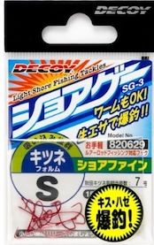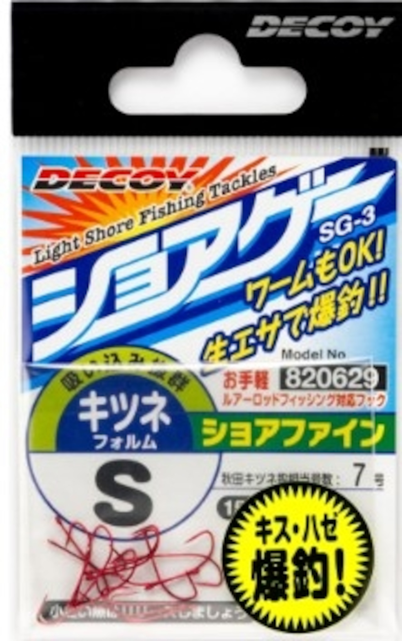 ベイトのズレを防止する為に、シャンク部にバーブを設定。抜群の刺さりを実現するマイクロバーブ仕様。結びが簡単なカン付仕様。キス等にアピールするレッド仕上げ。