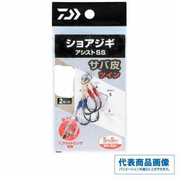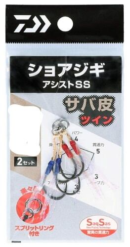 サバ付きは10〜60gのショアメタルジグに対応。シングル・ツインの2タイプ。驚異の貫通力サクサスフック。ベイトを演出するアピール力抜群のケイムラサバ皮とケイムラティンセル仕様。すぐにジグに装着出来るスプリットリング標準装備。