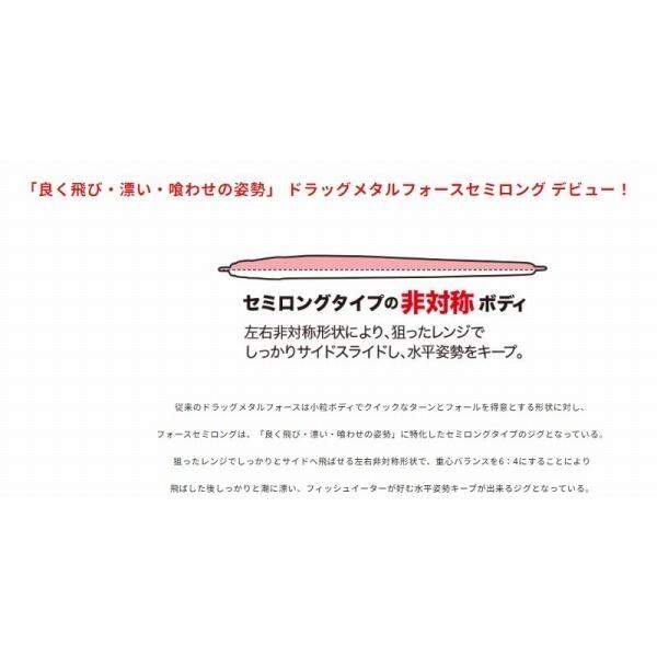 フォースセミロングは、「良く飛び・漂い・喰わせの姿勢」に特化したセミロングタイプのジグとなっている。