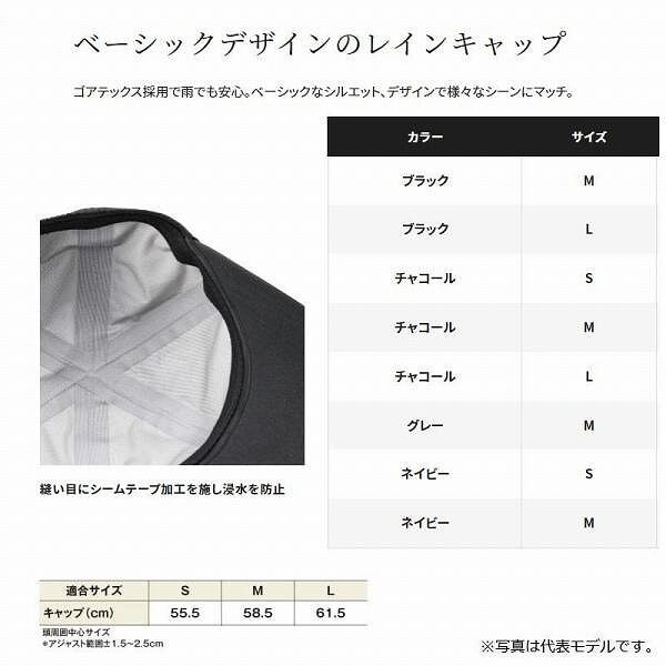 ベーシックデザインのレインキャップ。ゴアテックス採用で雨でも安心。ベーシックなシルエット、デザインで様々なシーンにマッチ。
