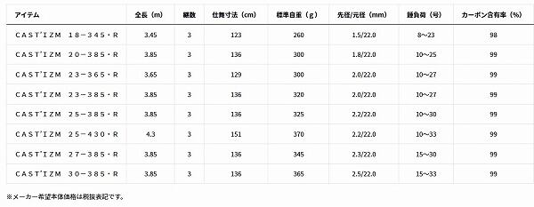 もっと遠くへ。その思いを叶えるべく投竿のノウハウを活かした形にした「CAST’IZM」。釣りのボーダーレス化に対応し、自由な発想で「投げる」釣りを愉しむためのライトコンセプト。並継ならではの調子と遠投性能に加え、さらにしなやかになった穂先は幅広い魚種に対応する。新たな提案となるキャスラバ対応モデル(18-345)や長尺モデル(25-430)もラインナップ。