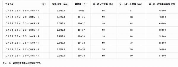もっと遠くへ。その思いを叶えるべく投竿のノウハウを活かした形にした「CAST’IZM」。釣りのボーダーレス化に対応し、自由な発想で「投げる」釣りを愉しむためのライトコンセプト。並継ならではの調子と遠投性能に加え、さらにしなやかになった穂先は幅広い魚種に対応する。新たな提案となるキャスラバ対応モデル(18-345)や長尺モデル(25-430)もラインナップ。