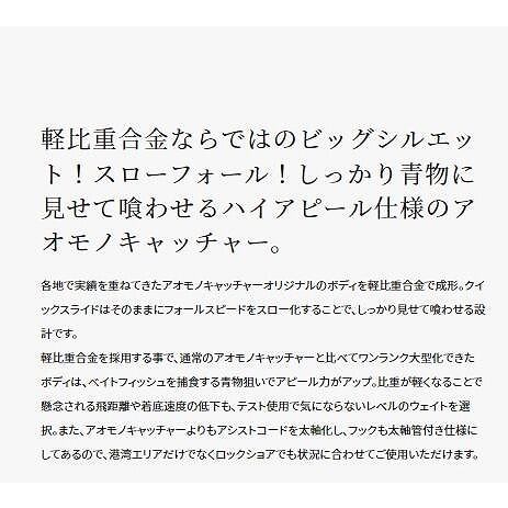 ・各地で実績を重ねてきたアオモノキャッチャーオリジナルのボディを軽比重合金で成形。クイックスライドはそのままにフォールスピードをスロー化することで、しっかり見せて喰わせる設計です。