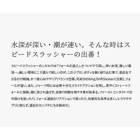 スピードスラッシャーのこだわりは「フォールの速さ」。きついドテラ流し、深い水深、激しい潮流・・。厳しい環境にこそ選んで欲しいのが、このジグだ。ボディを細く絞り込む事で、抵抗をできるだけ軽減。かつ重心はややリアバランス仕様。兄弟分のKing/DriftSlasherと比較しフォールが速い。また、ジャーク時には必要十分なスライドアクションを残し、素早くストレートフォールに復帰。