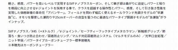 軽さ、感度、パワーを高いレベルで実現するSVFナノプラスカーボン、そして継ぎ部は曲がりに追従しパワーと粘りを格段に向上させるV-ジョイントを採用する事で、クラスを超越する操作性とパワー、感度、そして引き抜き性能を実現した価格破壊の革命児「アバンサー」。フィールドを問わず幅広く使えるオールラウンド先調子モデルの“早瀬抜”に、オモリを駆使した瀬釣りや25cmオーバーの良型を狙うのに最適なパワータイプ胴調子モデルの“急瀬抜”がラインナップ。