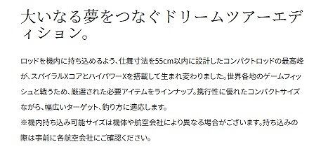 ロッドを機内に持ち込めるよう、仕舞寸法を55cm以内に設計されたコンパクトロッドの最高峰が、スパイラルXコア+ハイパワーX採用で生まれ変わりました。世界各地のゲームフィッシュと戦うため、厳選された必要アイテ