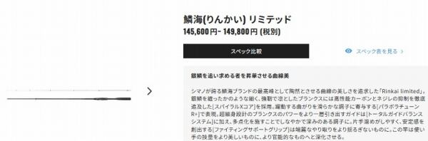 シマノが誇る鱗海ブランドの最高峰として陶然とさせる曲線の美しさを追求した「Rinkai limited」。銀鱗を纏ったかのような細く、強靭で凛としたブランクスには高性能カーボンとネジレの抑制を徹底追及した[スパイラルXコア]を採用。躍動する曲がりを滑らかな調子に寄与する[パラボラチューンR+]で表現。超細身設計のブランクスのパワーをより一層引き出すガイドは[トータルガイドバランスシステム]に加え、多点化を施すことでしなやかで深みのある調子に。片手溜めがしやすく、安定感を創出する[ファイティングサポートグリップ]は端麗なやり取りをより揺るぎないものに。この竿は使い手の技量をより美しいものに、より官能的なものへと深化させる。