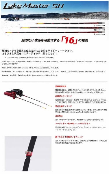 「レイクマスターSH」は16種類の構成からなるシステマティックな穂先。千差万別のフィールド環境や季節、天候といった状況を はじめ、使用する仕掛け、釣れるワカサギのサイズや活性などに合わせて、ベストな長さと調子をセレクトできます。緻密に削り 出した扁平波形グラスソリッドはアイテムごとの調子をリアルに表現。薄膜軽量塗装、そして3色のコントラストで視認性を高 めたカラーリングによって、繊細なワカサギのアタリを明確にキャッチすることができます。臨機応変、変幻自在。多彩な攻めを 可能にするNEWベーシック穂先の誕生です。
