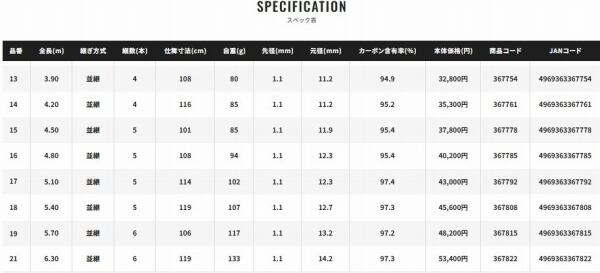 曲がるほどに秘めた力を実感する、ネジレに強いスパイラルXをこのクラスで初採用。スパイラルXの先進性は特に魚を掛けてから実感できます。沖で掛けた魚の瞬発的な抵抗をしなやかに受け止めてグイッと浮かせ、無駄な泳ぎをさせずに水面を滑らせて玉網入れできます。より正確な投餌が決まる軽やかな振り込み性能とともに、合わせがピシッと決まる水切れの良さも見逃せません。管理釣り場から野釣り、ボートでの釣りも余裕でこなす硬式先調子で、8〜21尺の全13アイテム。高貴で渋味のある紫色の総塗りは、合わせ部の竹色がアクセントになって、より高級感あふれる仕上がりを見せています。グリップ力に優れて滑りにくく、手にやさしい「しっとり綾織握り」もこのクラスでは初めて。見た目に美しい綾織りと握り込んだときのしっとり感が竿の総合性能を引き立てています。
