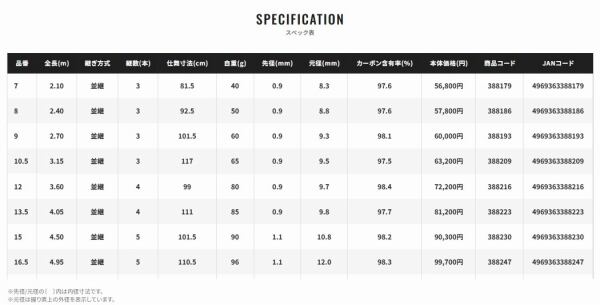 また、新しい長さ設定となる10.5、13.5、16.5の存在も見逃せません。今までに無かった新鮮な長さ設定であるということはもとより、中尺以上の竿交換をする場合のように30cm単位だと変化が少なすぎる時においても45cm単位で長さを替えて釣りをすることが効率的な釣りを実現します。こだわりの紋竹模様をまとった「朱紋峰 嵐月」で、是非新しいへらぶな釣りをお愉しみください。