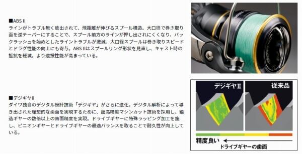 軽さと剛性の高さを両立した新型ボディにインフィニットストッパーを搭載することで、巻心地はしっかり&滑らか。PEラインがはじめからスプールに巻いてあるため、買ってすぐに釣り場で使える点もメリット。高剛性のデジギヤII、ライントラブルを激減させて快適な飛びをもたらすABS II、クロスラップ、ツイストバスターIIなどのダイワテクノロジーを豊富に搭載した充実の仕様。ブラックですっきりまとめられたデザインは様々なロッドに違和感なくマッチする。もちろん淡水・海水どちらのフィールドでも使用可能。