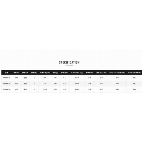 ミドルクラスのキャスティングゲームに適したHH-TKシリーズ。290は9フィート6インチで、シー バスロッドとして王道のレングス。30gのメタルバイブを全力で振り切ることが可能。330はサー フゲームに好適。波頭を超えミノー、ジグヘッドをヒラメ、マゴチへと届けます。370は磯からのヒ ラスズキ、青物、ハタ類など強烈な引きを長いレングスでいなしシモリをかわしてランディング。さ らに軽量オモリの投げ釣り、ライトカゴなど、爽快なキャスティングをご堪能ください。