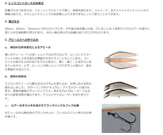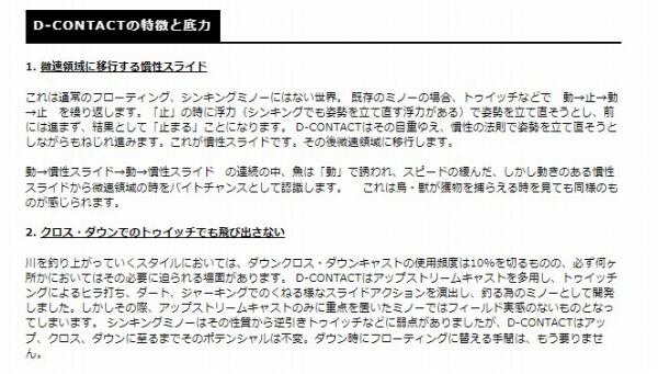 渓流のルアーフィッシングを一変させたヘビーシンキングミノー。 D-CONTACTは「慣性スライド」アクションを実現したミノーで、まさにヘビーシンキングミノーの火付け役とも言える存在です。